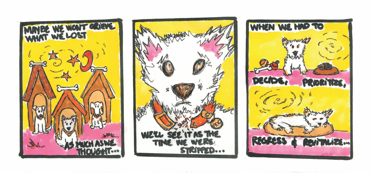So, I took a shot with the extra supplies of markers, highlighters, and Sharpies in the junk drawer of the desk in the extra room I was staying in. I wrote and created a comic about my feelings of the moment through the eyes of the West Highland Terrier I grew up with and dearly miss, Jack. I sent it to the Rescue Party email listed on the account, which, a few weeks later, stopped publishing in the wake of George Floyd’s murder and the racial justice protests that began at the end of the month.